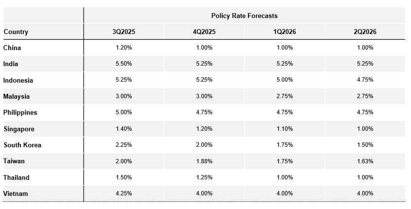 We expect China’s growth to decelerate from Q1’s 5.4% to about 4.3% in Q4, an overall 4.6% growth for 2025, due to a moderating positive fiscal impulse and the lingering weakness in the property sector. China’s weaker growth in H2 will drag on individual Asian economy by varying degrees.