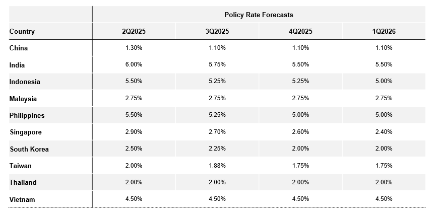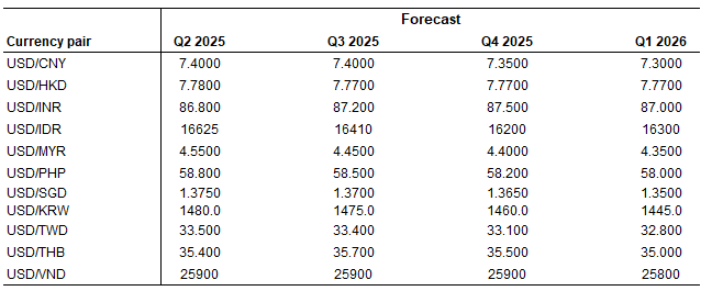 Asian FXs levels are not reflective of potential tariffs and their negative impact on Asian economies yet. We expect an overall depreciation of Asian currencies against the Dollar in Q2. However, with different degrees of exposures to tariffs, and country specific factors, some currency would weaken more than others.