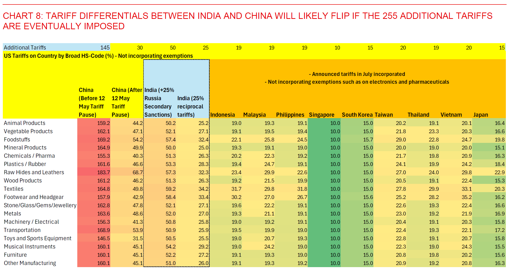 For India specifically, these 50% tariffs if they are eventually imposed on a sustained basis will be a significant negative for many labour intensive export sectors in India including textiles, gems and jewellery, toys, furniture, and many more. In addition, the negative impact to India’s GDP will likely much larger than the 0.3pp that we currently estimate (see India-US trade talks and tariffs – Delayed and denied?). At these announced rates, India’s tariffs would actually be higher than not just its export competitors such as Vietnam, but also China’s tariff rates across a whole range of products. This is even as we have highlighted India’s more domestic-oriented nature and current tariff exemptions on electronics and pharmaceuticals as mitigating factors. News overnight that Trump may impose a 100% tariff on semiconductors but impose 0% tariffs on companies such as Apple which shift production back to the US is a mixed message for India for now, given India’s current importance as an assembly hub for Apple for iPhones.