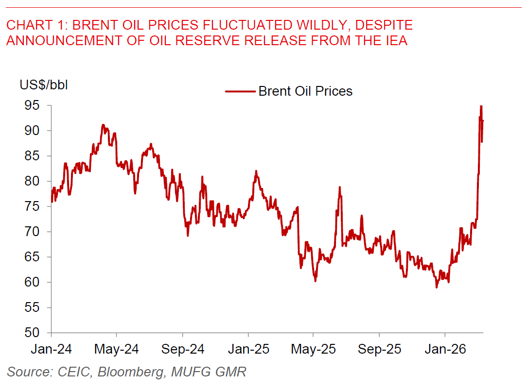 Brent oil prices fluctuated and rose above the US$90/bbl mark, while risk sentiment took some hit, and this came despite the announcement of oil reserves release by the International Energy Agency. Oil prices also rose as reports suggest Iraq’s oil ports have completely stopped operations due to targeting of two tankers within Iraq’s waters. In particular, the IEA agreed to discharge 400 million barrels from emergency oil reserves, its largest-ever release, in order to help contain a price spike driven by the Middle East war. For context, this number far exceeds the 183 million barrels that member states released in 2022 after Russia invaded Ukraine. The exact details around the pace, duration and location of the planned releases have not been announced, but there are some initial details around country allocation. Japan said it would release 80 million barrels, the UK will contribute 13.5 million, Germany about 19.5 million, France about 15 million while South Korea plans to release 22.5 million barrels. Meanwhile, the US administration plans to release 172 million barrels, and said this will be released over 120 days.