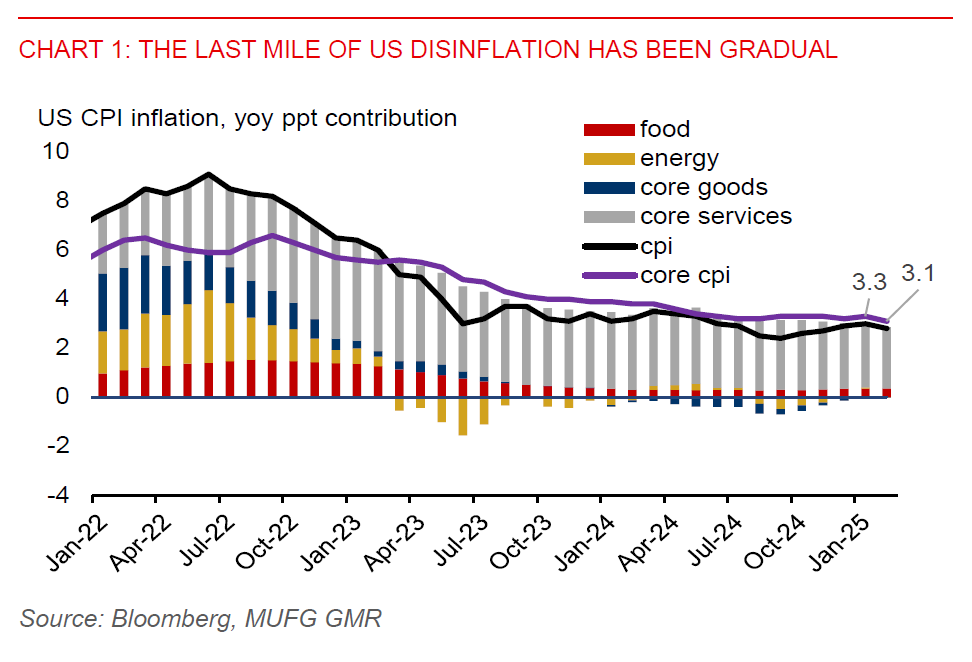 US disinflation has continued but at a gradual pace, while there is a risk that inflation could still pick up over the coming months due to tariff hikes. US headline CPI inflation slowed to 0.2%mom in February, from 0.5%mom in January, smaller than Bloomberg consensus of a 0.3% rise. Core inflation also slowed to 0.2%mom, from 0.4%mom in January. Notably, core services inflation was 0.3%mom, slowing from 0.5%mom in January, contributing just 0.15ppt to the month-on-month headline inflation rate. Contributions from core goods, food, and energy had also eased slightly. From a year ago, headline inflation was 2.8%yoy, down from 3%yoy in January, while core inflation was 3.1%yoy, down from 3.3%yoy in January.