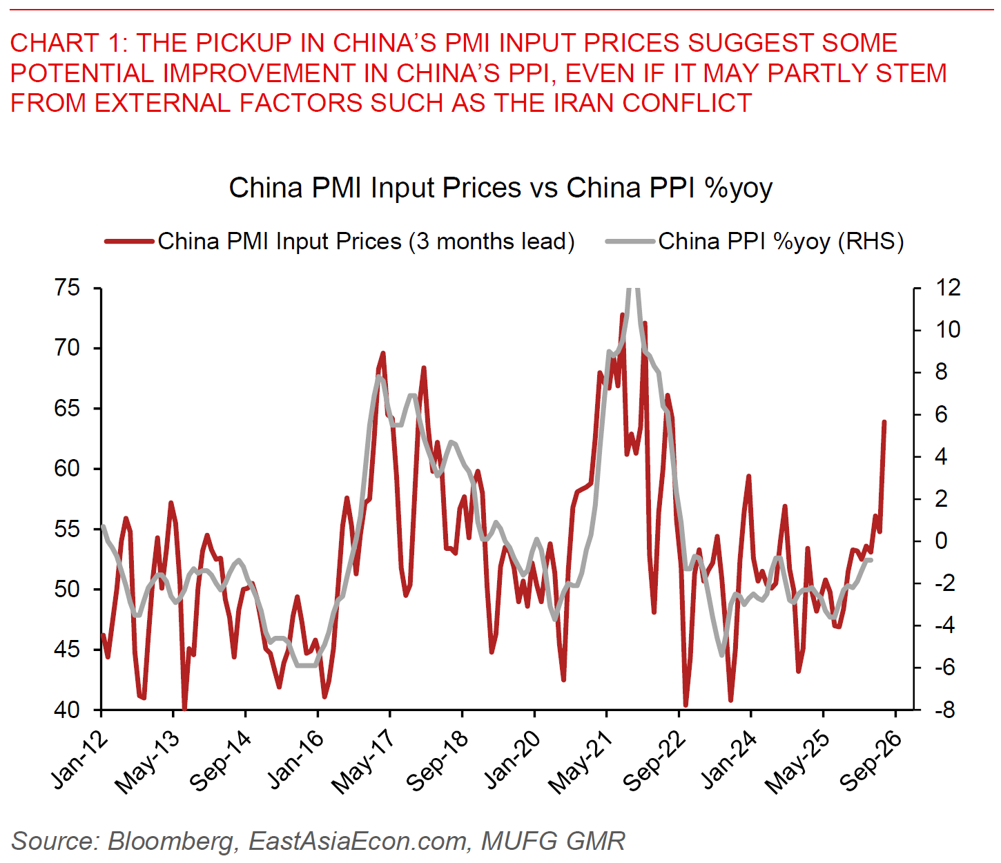 Beyond the Middle East conflict, the PMI numbers out of China yesterday was interesting not just because it was a touch stronger than expected, but also because we saw a sharp increase in the input price sub-component. While this may have been driven by external factors such as commodity prices and the Iran conflict, we note that the PMI input price sub-component has quite a good leading relationship with changes in China’s Producer Price Index, and as such may signal some improvement in price and inflation pressures moving forward even if driven by supply rather than demand.