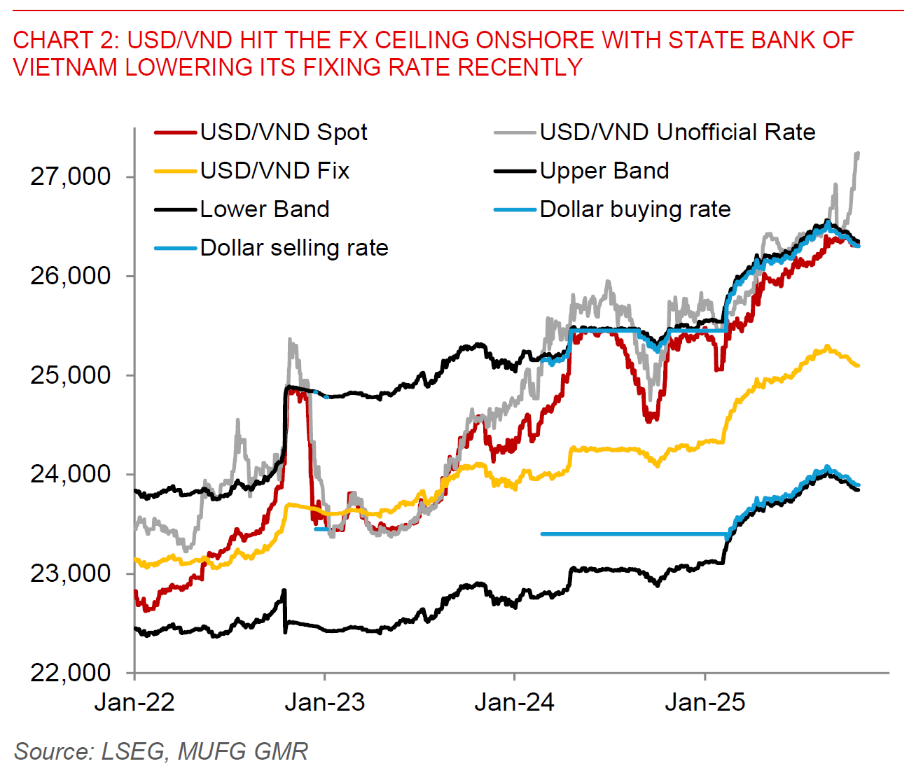 Our view at this point is that the situation today is unlike what we saw back in 2022 during the corporate bond market crackdown and investigations in Vietnam, in part given the reforms that have already been done to clean up the corporate bond market and banking sector. Nonetheless, we do continue to see VND being under modest depreciation pressure moving forward, and continue to forecast USD/VND moving towards 26,500 by year-end.