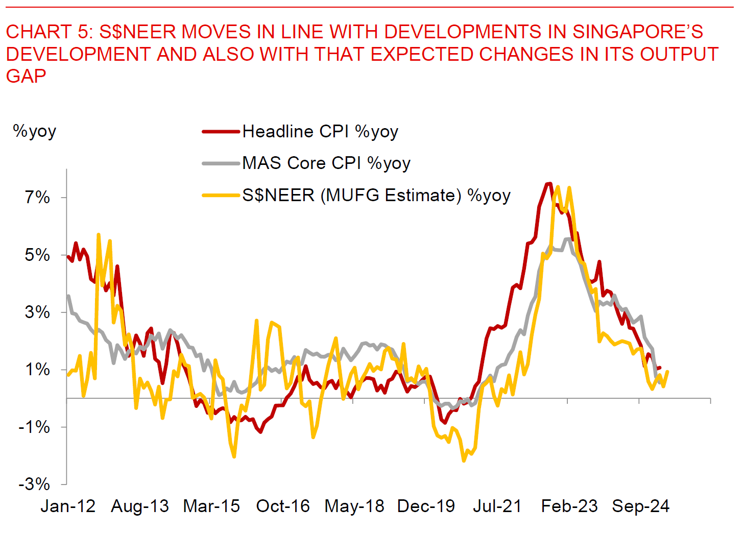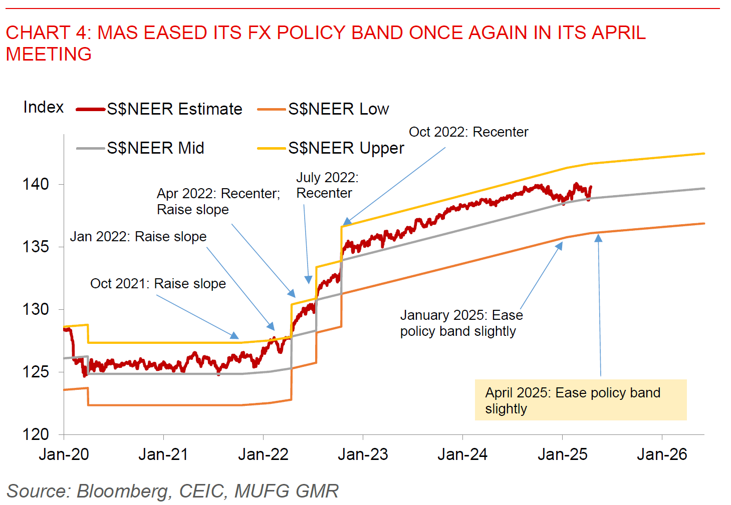 Singapore’s central bank announced its exchange rate policy decision, easing the slope of its policy band likely bringing it to 0.5% per annum from an estimated 1% currently, while maintaining the width and the level at which it is centered unchanged. This was in line with our forecast and also the consensus (see MAS preview – More policy easing). The guidance from the MAS was also dovish, indicating that Singapore’s output gap will turn negative, with the central bank also indicating that the risks to inflation are tilted towards the downside. Meanwhile, the MAS cut both its headline inflation and MAS core inflation forecast to 0.5-1.5% (down from 1.5-2.5% and 1-2% previously), with the government also lowering its 2025 GDP forecast to 0-2% from 1-3%. Overall, the impact from an FX perspective was relatively muted with S$NEER remaining around 0.7% above mid-point by our estimates, and with the S$NEER bouncing around the mid level for some time. We note that the path moving forward for S$NEER will also depending on the extent of Singapore’s inflation and growth slowdown from here beyond policy decisions, with tariff risks raising meaningful left tail risks to the economy.