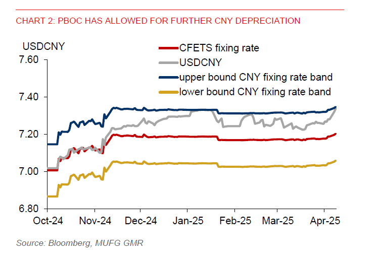 Asia ex-Japan currencies have broadly weakened against the US dollar. The PBOC has set a higher USDCNY daily fixing rate of 7.2038 yesterday, with the upper bound of the policy band at 7.3479, signalling it will allow for further yuan depreciation to partially offset tariff impact. USDCNH broke the 7.3750 high, bringing the pair to unchartered territory. This will continue to have spillover effects on regional currencies. Notably, IDR (-1.8%) and THB (-1.8%) have led losses in the region, followed by VND (-0.9%). We look for further depreciation of regional currencies ahead.