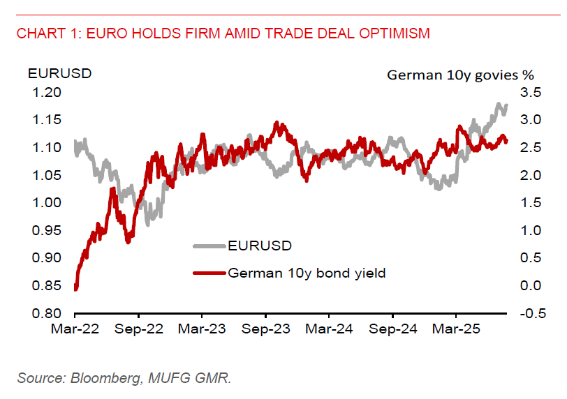 The ECB could hold interest rates steady at the meeting today, as it awaits greater clarity from ongoing EU-US trade talks and assess the impact of past policy easing measures. The European Union is reportedly advancing toward a trade agreement with the United States, under which a 15% tariff rate could be applied to most EU imports. Key sectors, including spirits, medical devices, and aircrafts, are expected to be exempt from these tariffs. If finalized, the 15% rate would align with the tariff rate seen in the recently concluded US-Japan trade deal. Nonetheless, a 15% tariff could still impact price competitiveness and profit margins for EU exporters in the US market.