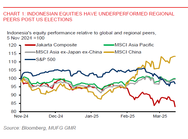 In Indonesia, there has been a simultaneous sell-off in equities, bonds, and the rupiah. Notably, the Jakarta Composite Index (JCI) fell by 7% at one point yesterday, triggering a temporary trading halt, before paring back some of its losses. The decline in JCI could be partly due to rumors about veteran Finance Minister Sri Mulyani resigning. Sri Mulyani has dispelled the resignation rumors by saying she will stay as the finance chief, while emphasizing that Indonesia’s fiscal health remains sound and the budget deficit for 2025 will stay at 2.5% of GDP. Amidst challenging domestic and global headwinds, we remain cautious about the outlook for Indonesia's equities and the rupiah.