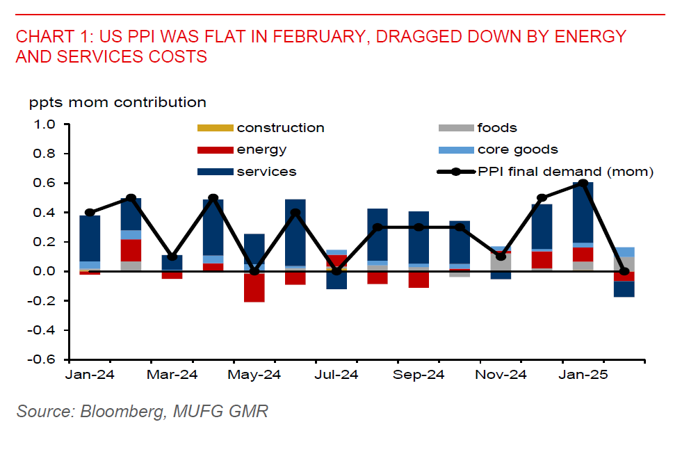 US producer price index was flat in February, down from 0.4%mom in January and below Bloomberg consensus of 0.3%mom. Core PPI (ex-food and energy) fell 0.1%mom, from +0.3%mom in January. From a year ago, headline and core PPI moderated to 3.2% and 3.4%, respectively, from 3.5%yoy and 3.6% in January. Nonetheless, with core PCE inflation likely to remain above the Fed’s 2% target, with scope for a pickup due to tariff hikes, the Fed could remain patient with rate cuts. There could possibly be just two 25bps rate cuts in the rest of this year. The fed funds futures markets have unwound US rate-cut bets to less than 3 cuts, from more than 3 cuts being priced in at the start of the week. Further reduction in market expectation for Fed rate cuts could provide support for the US dollar.