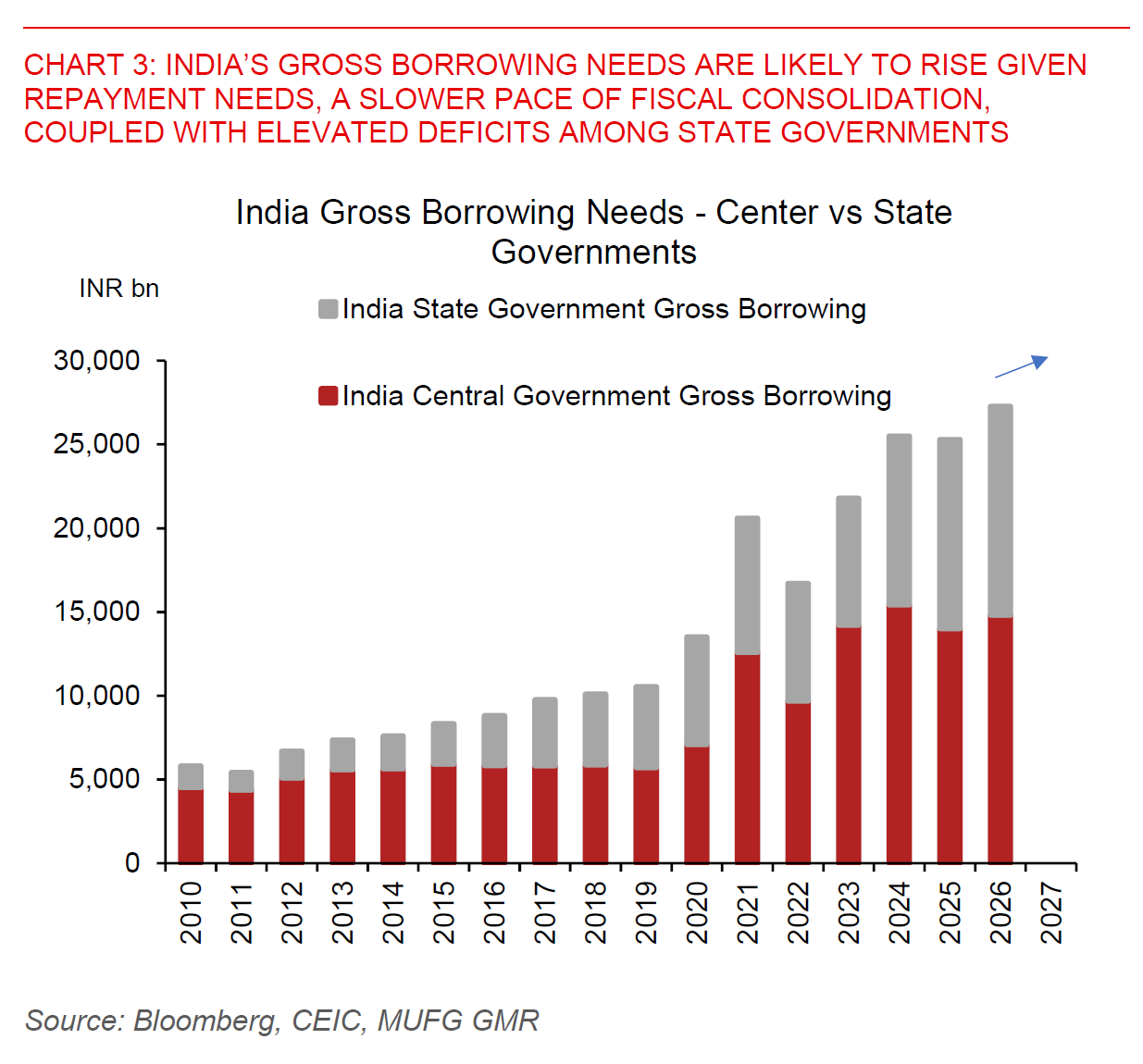 What complicates this FY2026/27 Budget somewhat is that the government is also moving to now target the central government debt to GDP ratio, from the fiscal deficit previously. The expectation for markets is that India will likely target government debt to GDP at around 54-55% for FY2026/27 from 56% of GDP currently, while this would probably imply a central government fiscal deficit anchor of 4.2% of GDP from 4.4% previously. The central government’s gross borrowing need is as such likely to rise to INR16.5 trillion with debt maturities of around INR5.5trillion for FY2026/27, with net borrowing still quite elevated above INR11trillion and state level borrowing remaining high for FY2026/27.