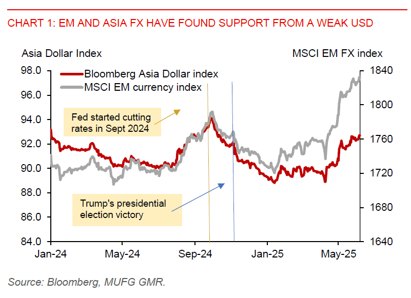 Asian currencies strengthened against the US dollar yesterday, led by the Korean won (+0.7%), Malaysian ringgit (+0.5%), and Thai baht (+0.6%). If the upcoming US nonfarm payrolls report comes in significantly weaker than expected, it could trigger a dovish repricing of the Federal Reserve’s rate path for H2 2025. This would likely weigh on the US dollar and support capital inflows into Asia, particularly benefiting economies with strong domestic demand and persistent trade surpluses.