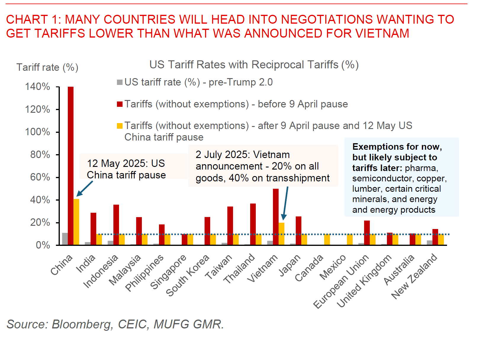 As with the US-Vietnam tariff announcement, we suspect that even if there is an agreement with some countries it will likely be short of details for now and focused more on lower-hanging fruits. Nonetheless, many countries will also be heading into these talks wanting to get a lower rate than the 20% Vietnam received, especially if their exports directly compete with Vietnam, even as they keep a wary eye on demands for higher tariffs on “transshipment” goods. On that front for example, LiveMint reported that a trade agreement with India has cleared the US Trade Representative is awaiting Trump’s approval. If India agrees to US’ demands in agriculture and related sectors, its exports could only face the baseline 10% tariff. Meanwhile, if India refuses, tariffs could go up to 20%, representing a 6% relief from the original 26% reciprocal tariff, but at face value similar to what Vietnam has received. The impact will also depend on what India may get in return including preferential tariffs on additional sectors.