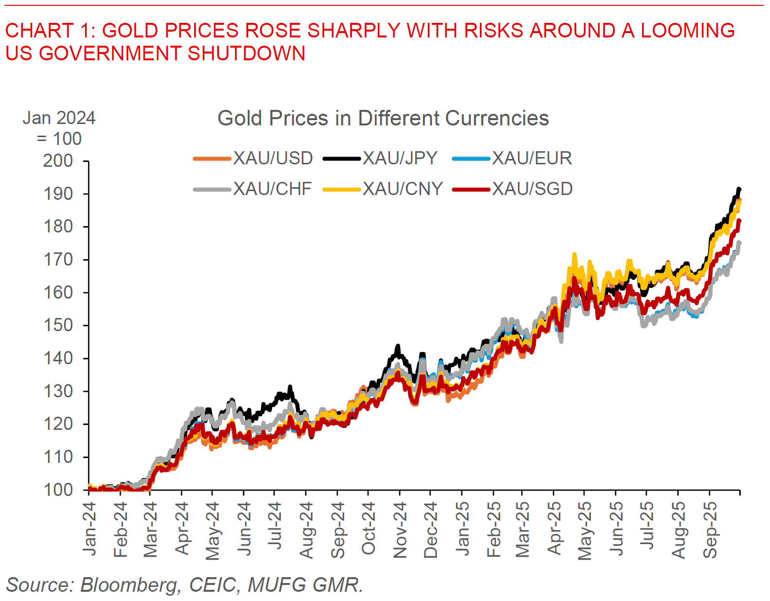 The second key theme is the perennial drama and deja-vu around a government shutdown in the US, with US Vice President JD Vance saying he believes the government is on track to shut down and seeking to pin the blame on Democrats. President Trump met with top congressional leaders overnight, but with the two sides no closer to resolving Democrats demands to extend health-care subsidies and reverse Medicaid funding cuts included in Trump’s signature tax legislation passed earlier this year. In this year’s version of the game of chicken, President Trump is threatening to permanently fire federal workers en-masse if the government shuts down. This would also delay the release of key economic indicators, including the important non-farm payrolls numbers to be released on Friday. While US equities have remained resilient, the Dollar has sold off to start the week with a sharp rise in alternative safe haven assets such as gold.
