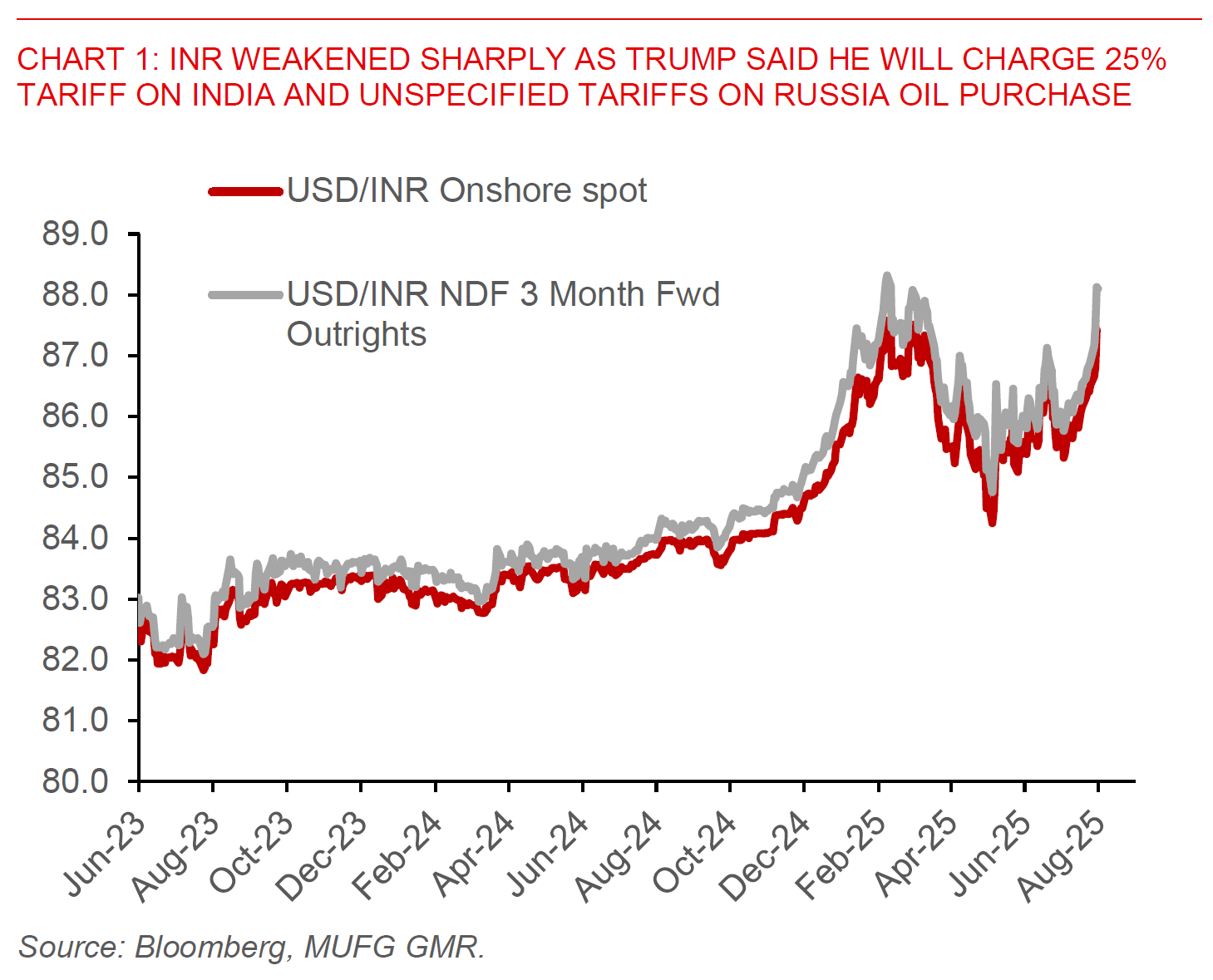 From a research perspective, we have been assuming that India strikes a trade deal with the US with tariffs likely below 20%. As such, the latest announcement that US-India tariffs will likely be 25% and also with additional unspecified penalties on Russian oil purchase is a downside surprise relative to our forecast assumptions for USD/INR. At the same time, other countries which compete directly with India (eg. Vietnam) also got lower rates and so competitive advantage for India’s export sector could be eroded to some extent if these proposed tariff rates stick.