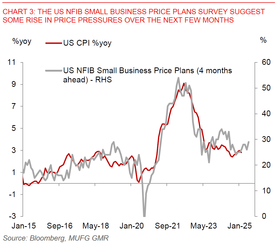 Looking ahead, markets will focus on the US NFIB Small Business Sentiment index, together with inflation prints out of Indonesia and Taiwan. We note that the subcomponents and in particular the price plans data typically has quite a good leading relationship with US inflation, and could as such give us some clues as to whether inflation pressures in the US are starting to build up. We are already seeing some signs of that in the prices paid components of the US ISM manufacturing survey.