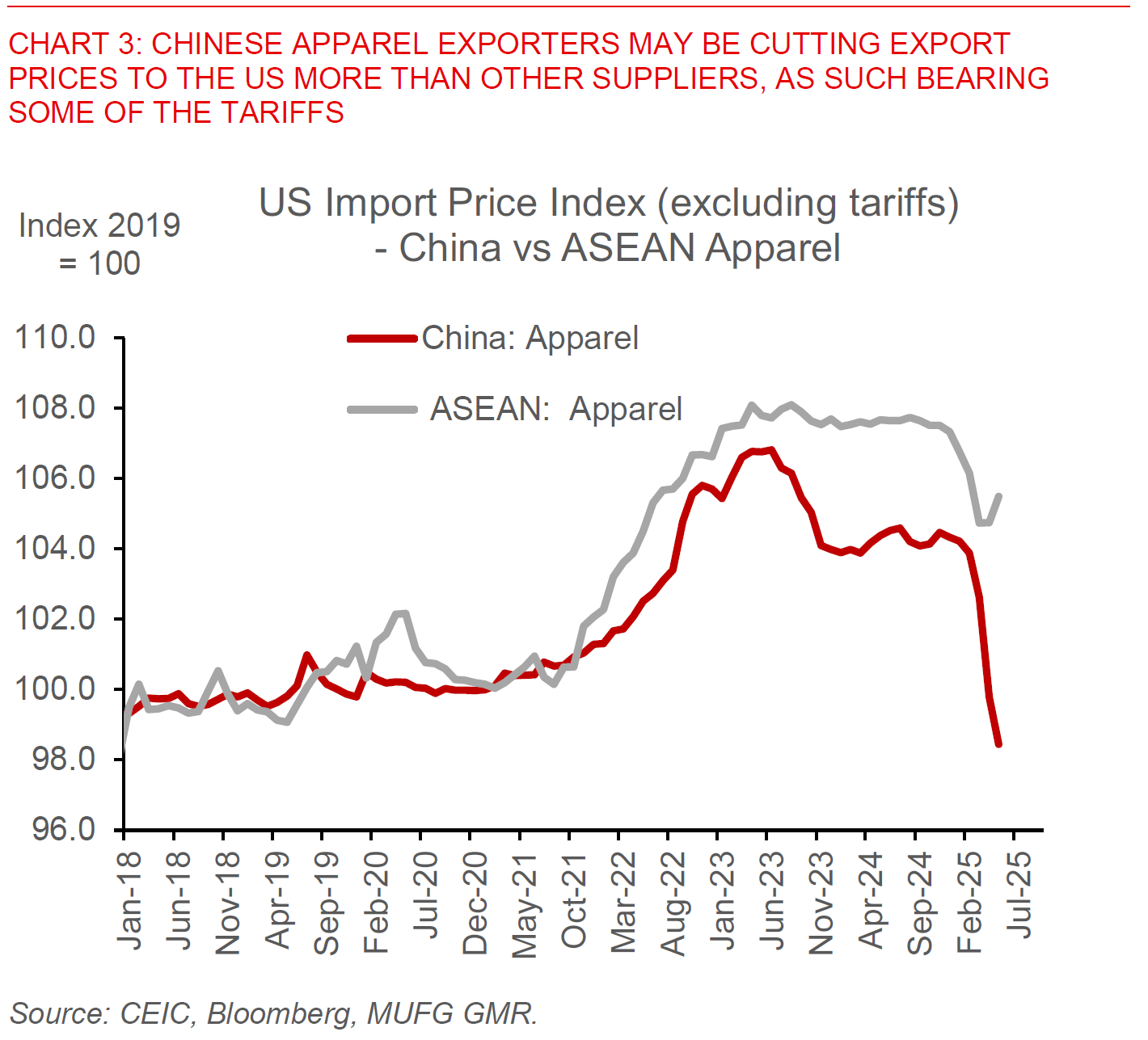 These US inflation developments are to some extent corroborated by other datapoints, showing that at least so far part of the cost of tariffs may have been shared along the way by other players. The sharp fall in Japan passenger car export prices fits well with the data showing continued softness in auto CPI inflation, while import front-loading, inventory stocking and a shift in the composition of US imports away from China to the rest of Asia could also have softened the effective tariff rate paid by US corporates and ultimately US consumers. US import price data shows a mixed picture across products, with some sharp cuts in apparel import prices from China exhibiting perhaps some cost sharing with US importers, but with steady prices in other manufacturing items such as furniture and household goods, and fits well with the general picture that we see in the June CPI inflation showing some passthrough where perhaps substitutes are scarce and pricing power is stronger in the sector. As such, the extent of inflation pass-through moving forward will also depend on whether these offsets including soft US demand and services inflation dominate.