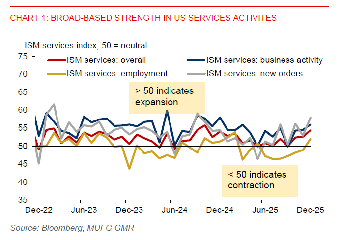 In contrast, the ISM services index delivered a strong upside surprise, climbing to 54.4 in December from 52.6 in November, beating consensus expectations of 52.2. The improvement was broad-based, with new orders jumping to 57.9 from 52.9 and employment rebounding to 52.0 from 48.9. The rebound in services employment is particularly notable, helping to ease concerns about a sharp slowdown in the labour market. Meanwhile, the prices paid sub-index eased slightly to 64.3 from 65.4, indicating that inflationary pressures remain elevated but are gradually moderating.