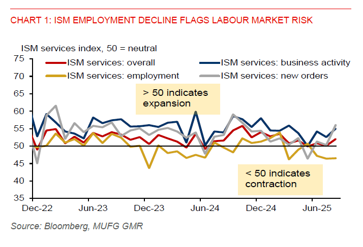 US macro signals were mixed ahead of nonfarm payrolls. US initial jobless claims rose to 237k in the final week of August, up from 229k in the prior week, while ADP employment slowed sharply to 54k, missing Bloomberg consensus (+68k) and July’s +106k. Meanwhile, the ISM services index surprised to the upside, rising to 52.0 from 50.1, driven by stronger new orders. However, the ISM services employment sub-index remained in contraction at 46.5, pointing to underlying labour market softness. The Fed’s Beige Book showed little to no growth across most districts, reinforcing signs of a cooling economy. US yields fell modestly on weaker jobs data, while the USD edged higher, likely driven by the stronger ISM services reading.