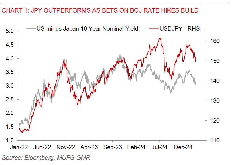 Japan’s inflation accelerated more than expected in January, with CPI excluding fresh food rising 3.2%yoy – the biggest gain since June 2023. This acceleration was slightly faster than economists’ expectation for a 3.1% increase, and was pushed up by higher processed food prices. While there was a mild slowdown in service price inflation, this was largely due to a technical factor that relates to last year’s high base when the ministry changed prices of foreign travel packages. Over the course of this week, there were increasing signs that the Bank of Japan may be more confident of delivering another rate hike. First, Bank of Japan Governor Ueda said he did not discuss rising JGB yields yesterday in a meeting with Japanese Prime minister Shigeru Ishiba. Second, BOJ Board member Hajime Takata said on Wednesday that it’s important to continue considering gradual rate hikes, while also noting that Japan’s bond yields are moving in line with the market’s view of the economy. We continue to see a good chance of JPY outperforming moving forward, notwithstanding tariff risks.