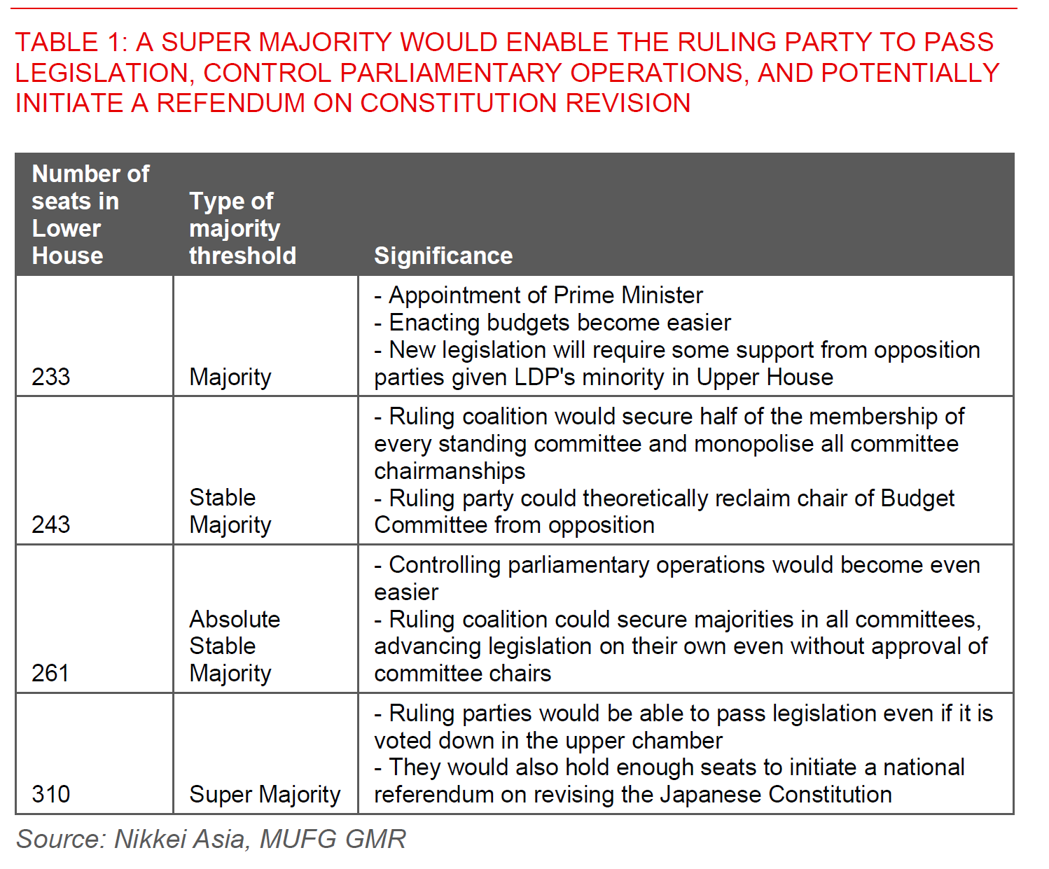 This significant magnitude of the win is important as the LDP could pass legislation even if it is voted down in the Upper House where the LDP is in the minority. In addition, the LDP will be in full control of parliamentary operations and process, including the Budget Committee, and could also have enough seats to initiate a national referendum on revising the Japanese Constitution in theory.