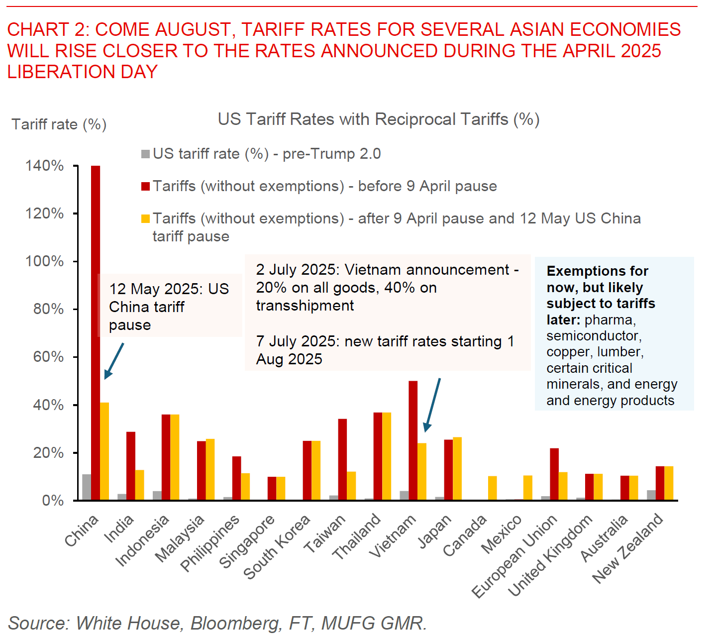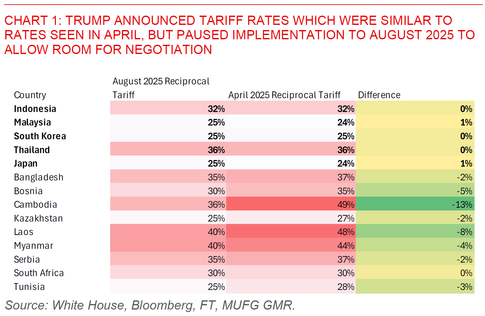 President Trump announced a new set of tariffs for around 14 countries post the 90-Day Liberation-day tariff pause, while also postponing the implementation to 1 August to provide some time for further negotiations. Across the key Asian markets we cover, the tariff rates are essentially the same as what was announced in April, including for Japan (25%), South Korea (25%), Indonesia (32%), Malaysia (25%), and Thailand (36%), coupled with some small rounding adjustments. The likes of Cambodia and Laos saw bigger cuts to tariffs but the absolute rates remain high at close to 40%.