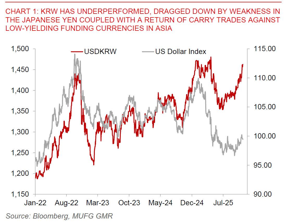 Markets took on a more mixed tone overnight, with divergence across Asian currency pairs. The Malaysian ringgit and to a smaller extent the Indian Rupee were the key outperformers in Asia, with the former helped by recent conclusion of a trade deal with the US and implementation of structural and fiscal reforms, while for India the key was the potential for the conclusion of a trade deal with the US, with President Trump saying both the US and India are quite close to coming to a deal. Underperformers in Asia include the South Korean won, which has been weak despite the rebound in risk sentiment in the local KOSPI equity market post news that South Korea’s finance ministry could lower the top taxation rate on dividend to 25% from 35%, with also news that the NPS could increase the domestic allocation to stocks. Part of the FX underperformance could reflect the spillovers from the weakness in the Japanese Yen to KRW, but to some extent the return of carry trades against low Asian yielding funding currencies including the likes of KRW and TWD in our region may be part of the story here as well, including through the transmission mechanism of domestic resident outflows, and despite the recent conclusion of trade deals.