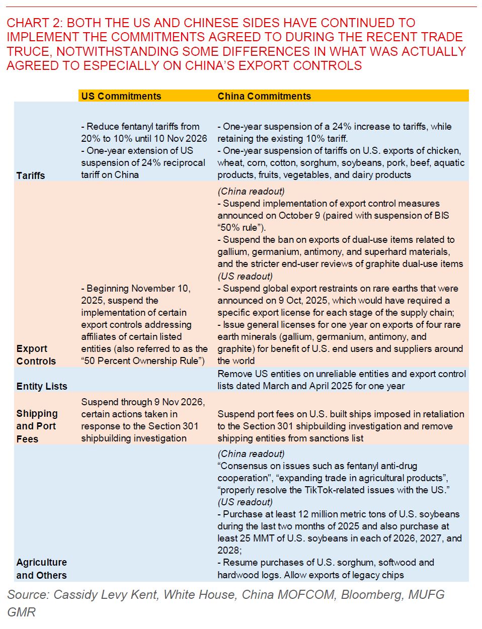 To our minds, the licensing regime by China itself is not up for negotiation, while “general licenses” as defined by the US would seem quite different from the reality of what China may ultimately implement including on restrictions on military use. For now, the good news is that both sides continue to push through good faith implementation of the various aspects of the trade truce including on port fees, suspension of the BIS 50% affiliate rule, among others, and we still view the developments so far positively