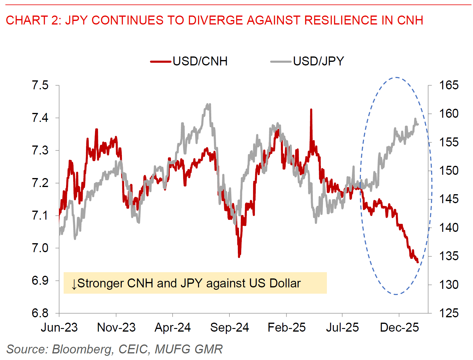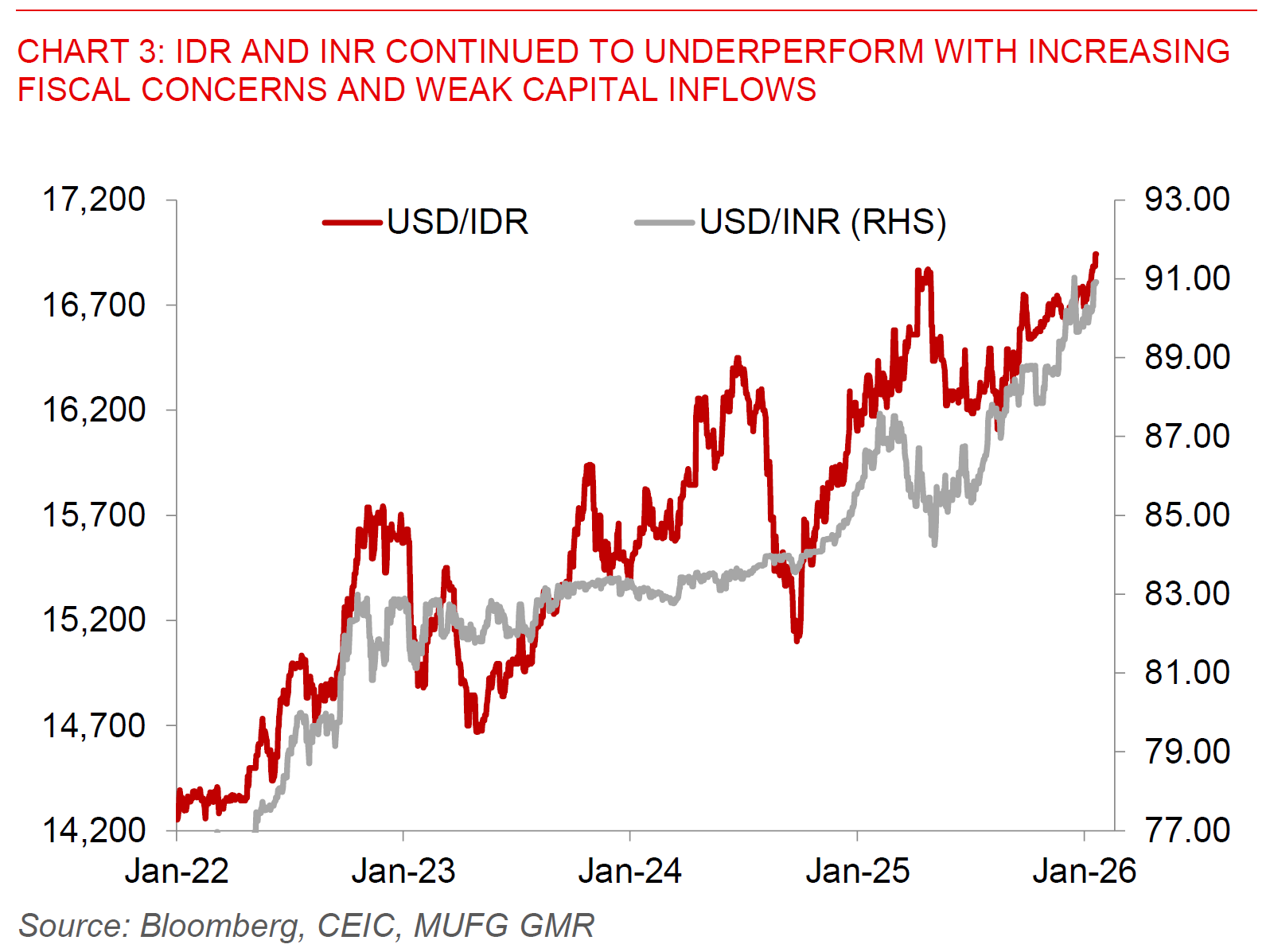 JGB bond yields rose sharply, while USD/JPY moved up above the 158 level with some FX underperformance, as markets digested the implications of the upcoming 8 Feb snap Lower House elections. Meanwhile, Asian currencies continued to show divergence, with outperformance in the Chinese renminbi contrasting with underperformance in the high-yielders such as IDR, INR, PHP, driven partly by fiscal concerns in these countries.