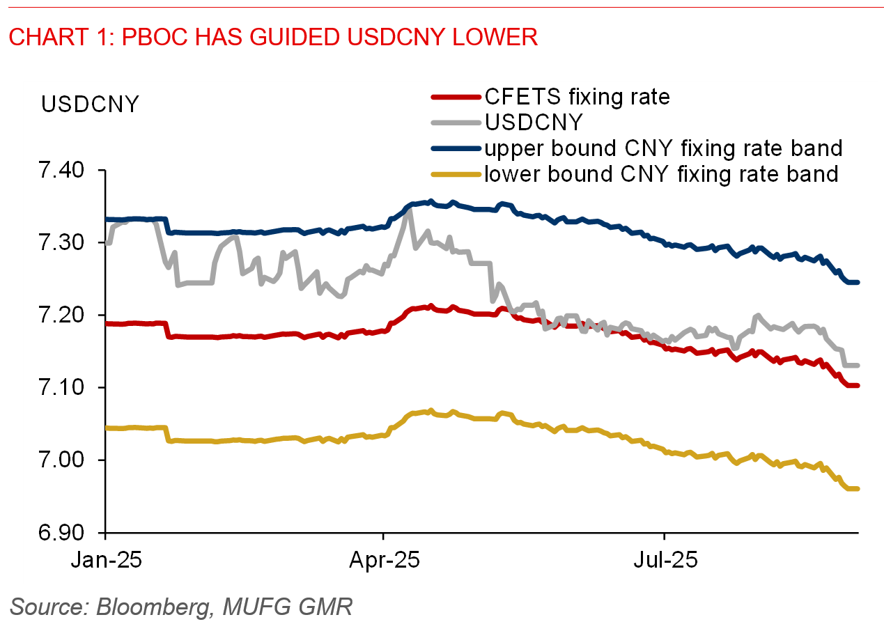 Since the Jackson Hole symposium last week, USDCNH has declined by 0.8%, supported by dovish signals from Fed Chair Powell and proactive measures by the PBOC. The PBOC has lowered the daily USDCNY fixing rate to around 7.1030, helping to contain depreciation pressures on the yuan. However, underlying growth concerns remain, underscoring the need for further macro policy support. The official NBS manufacturing PMI for August, released over the weekend, came in at 49.4 - still in contraction territory. On a more positive note, services activity held up at 50.3, indicating modest expansion. Meanwhile, the US federal appeals court has also ruled that most of President Trump's tariffs are illegal.
