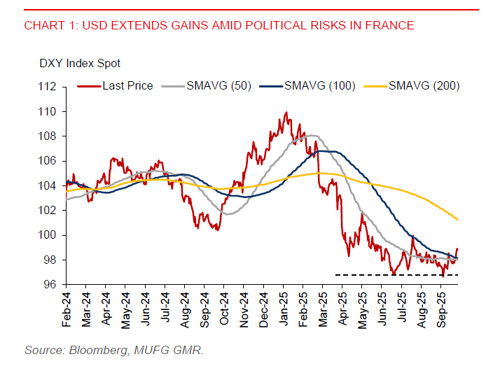 The US dollar (DXY) has extended its upward momentum, building on firm support around the 96.00–97.00 range, as rising political uncertainty in France continues to weigh on the euro. French President Macron is expected to appoint a new prime minister this week following the brief tenure of outgoing Premier Sebastien Lecornu. However, the leadership change is unlikely to resolve the underlying political instability. The incoming prime minister will face a challenging task of navigating a deeply fragmented parliament and forming a functional cabinet. While Macron has avoided calling a snap election for now, the political gridlock likely remains. Reflecting market concerns, the yield spread between French and German 10-year government bonds has widened sharply to 83 basis points, which is just shy of its December 2024 peak of 88 basis points.