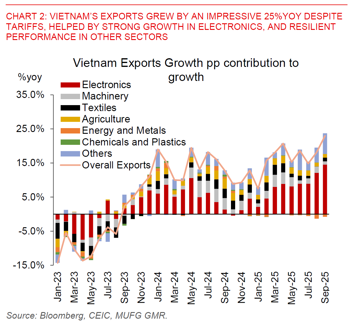 Last but not least, Vietnam released its export and trade indicators for September, providing one of the first read across Asia for export activity and the impact from tariffs. The numbers were impressive, with a 25%yoy rise in exports, and driven by more than 30% rise in trade and exports to the US. Of course, once again the full impact of tariffs may not have been felt yet, with some goods on water likely still exempt from tariffs at least till October, while some key products such as electronics still receiving exemptions for now. The data suggests as such, with a 66%yoy surge in electronic exports, but outside of that the export numbers were probably more resilient than a 20% tariff would suggest, with a 47%yoy rise in textile fibres, 9% rise in textiles and footwear, 12%yoy rise in machinery equipment and 13%yoy rise in furniture.
