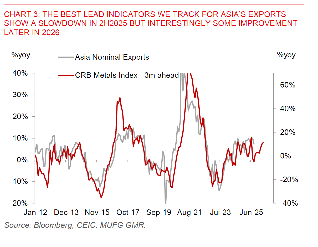Moving forward, the key for the rest of Asia’s FX and rates markets is also the pace of moderation and more importantly the outlook into 2026. Interestingly, some of the best leading indicators we like to track for Asia’s exports including metal prices suggest some modest slowdown in exports into 4Q2025, but interestingly some tentative signs of improvement in 1H2026 for what it’s worth.