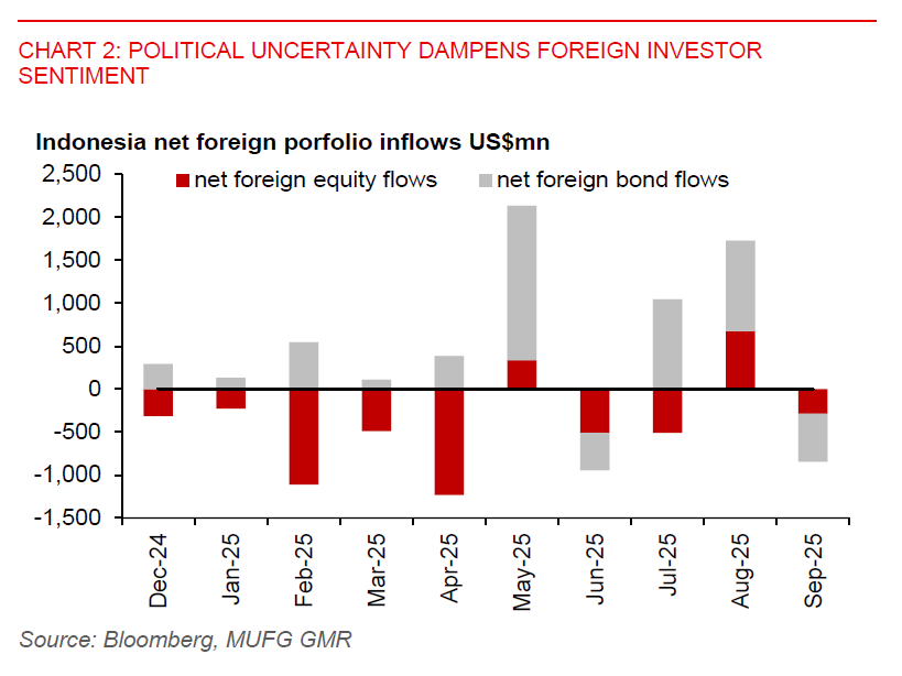 In Indonesia, the rupiah has come under renewed pressure following the 8 September cabinet reshuffle, which saw the replacement of long-serving Finance Minister Sri Mulyani, a figure highly regarded by international investors, with the lesser-known Purbaya Yudi Sadewa. Purbaya is an experienced economist and also the Chairman of the Deposit Insurance Corporation. This leadership change at the finance ministry has raised concerns over the country’s fiscal policy outlook, given the lack of clarity around Purbaya’s policy stance in the near term.