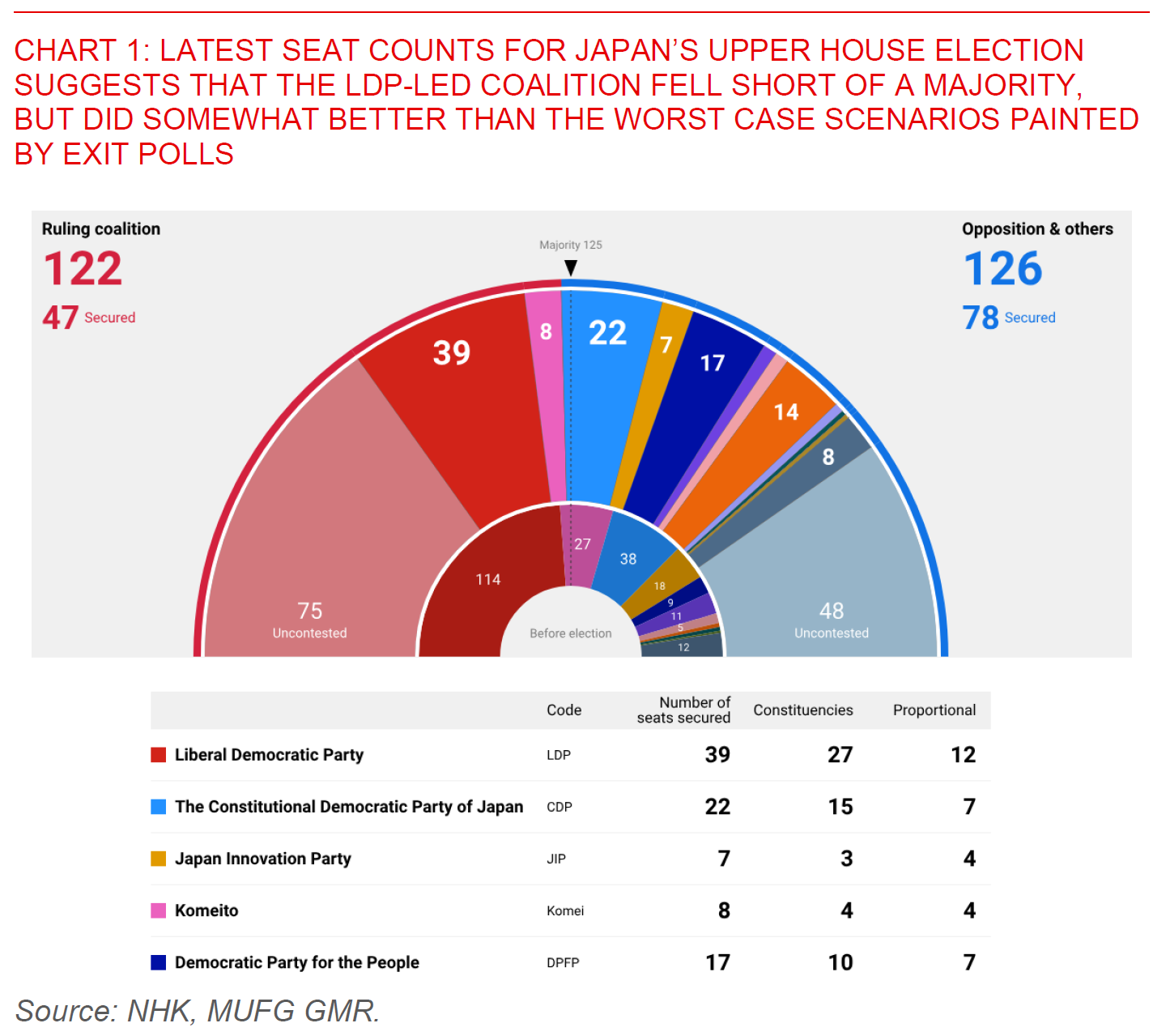 In Japan’s Upper House Elections, the ruling Liberal Democratic Party along with partner New Komeito lost its majority in the chamber, according to public broadcaster NHK. This marks the first since 1955 that the LDP-led government has fallen below a majority in both the lower and upper house, potentially increasing political instability in Japan. The latest seat count by NHK had LDP and Komeito combining for 47 seats in this election (LDP: 39 and Komeito: 8). If upheld, this seems to have fallen short of perhaps more disastrous scenarios indicated in Initial exit polls (32-51 seats), but is overall likely a repudiation still for Prime Minister Ishiba.