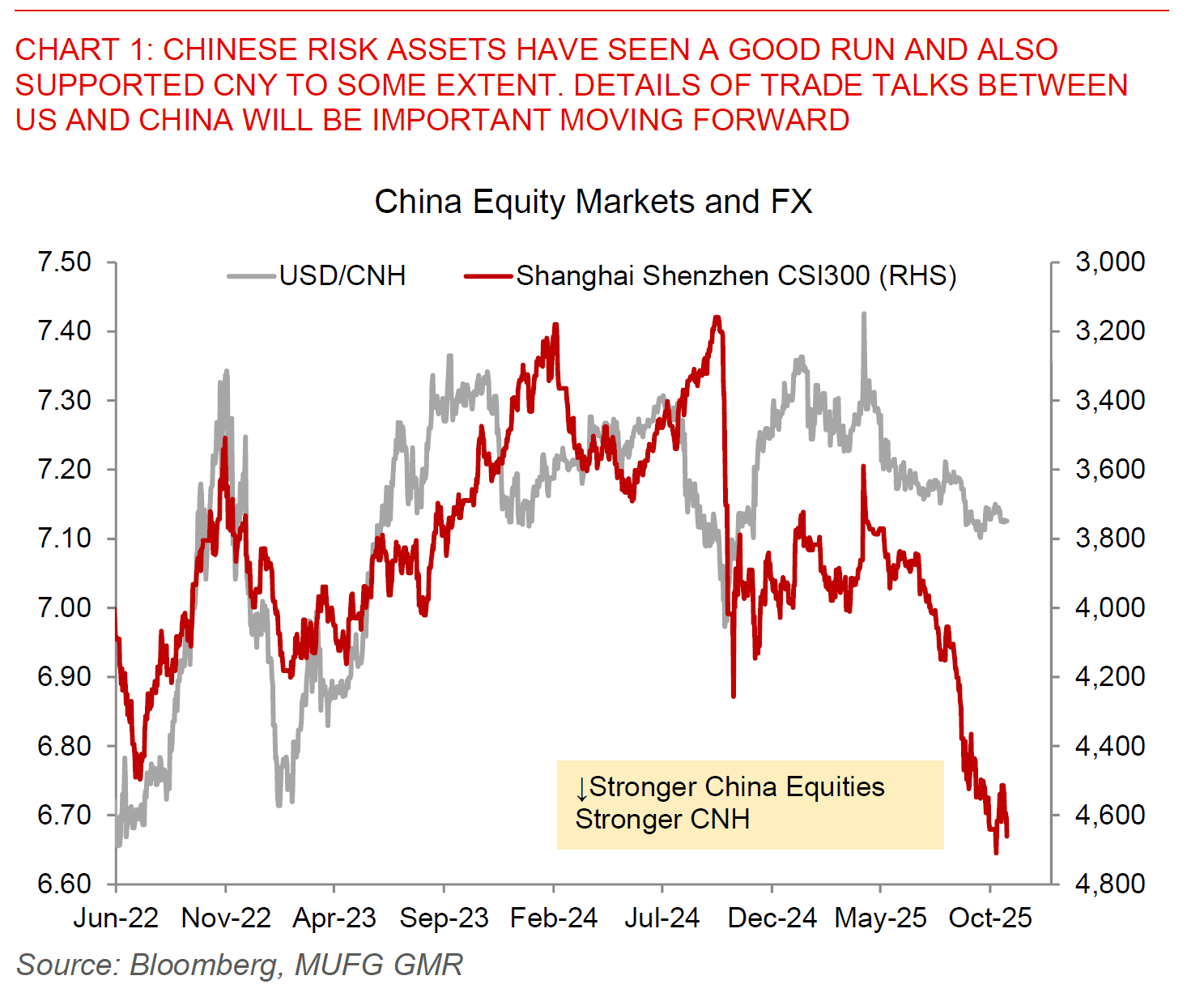 To our minds, for China to actually agree to a one-year delay in implementation of China’s rare-earth export controls would probably require some additional meaningful concession from the US side (see Asia FX Talk – China significantly expands export controls on critical minerals). In a best case scenario based on what we know was discussed, we could see some reduction in the fentanyl related tariffs for China (currently at 20%) and/or changes in shipbuilding and port fees, which if true and depending on the finer details could be supportive of Chinese risk assets and CNY.
