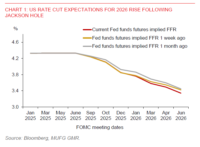 On US inflation, higher tariffs have only led to a modest pickup in goods inflation on a month-on-month basis in June and July. Powell suggested that a reasonable base case is that the tariff effects on inflation will be relatively short-lived. Given the softening labour market, Powell downplayed the risk of a wage-price spiral. Inflation expectations remain well-anchored around 2%, suggesting that tariff-driven price increases may not lead to persistent inflation.