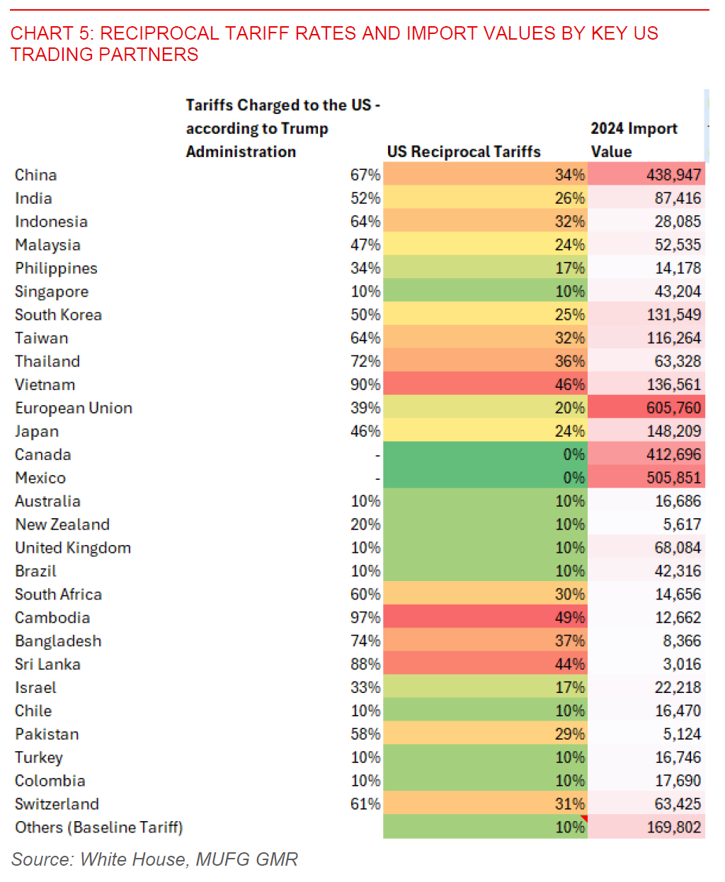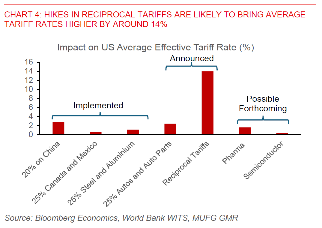 In what we estimate to be the largest tariff hike by the United States since the 1930s Smoot-Hawley tariffs, President Trump announced his reciprocal tariff plan overnight. The administration set a minimum baseline tariff of 10% on all countries, and additional reciprocal tariffs up to 49% for 60 countries.