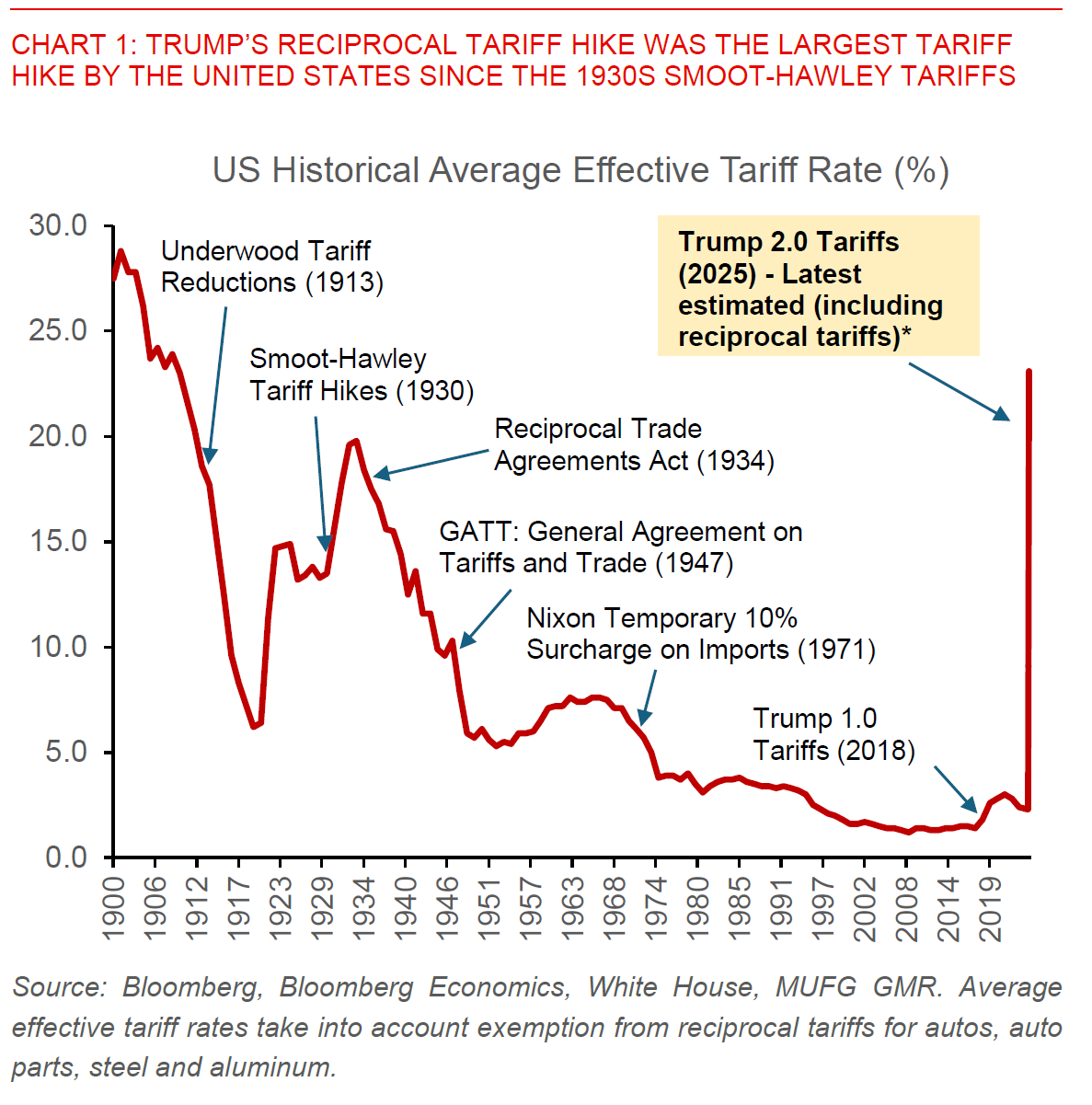 We estimate US average effective tariff rates are now expected to rise to 23%. This would bring tariff rates above those last seen in the 1930s.