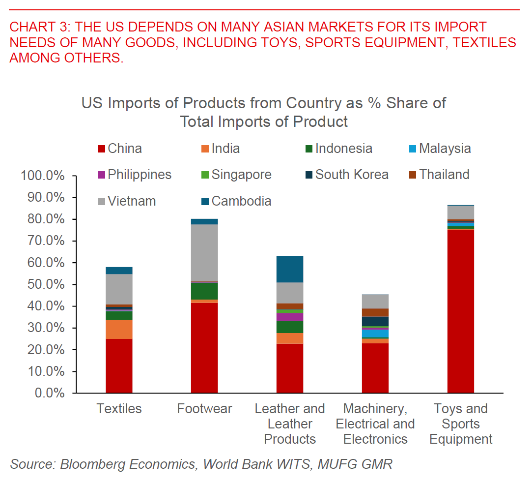 Nonetheless, we would note that FX is a relative price, and the magnitude of Asian currency weakness will also depend on how investors and the market view the relative growth and yield impact in the US versus other countries. With such a broad swath of countries being negatively impacted, we note that the ability for the US to substitute to alternative supplies is much more limited, and hence the possible growth and inflation hit to the US itself. To make it more concrete, we note that Asian economies supply 87% of US import needs of toys and sports equipment, and also 80% of US imports of footwear. These are the products which also likely have much negligible domestic capacity to ramp up supply to meet domestic demand within the US.