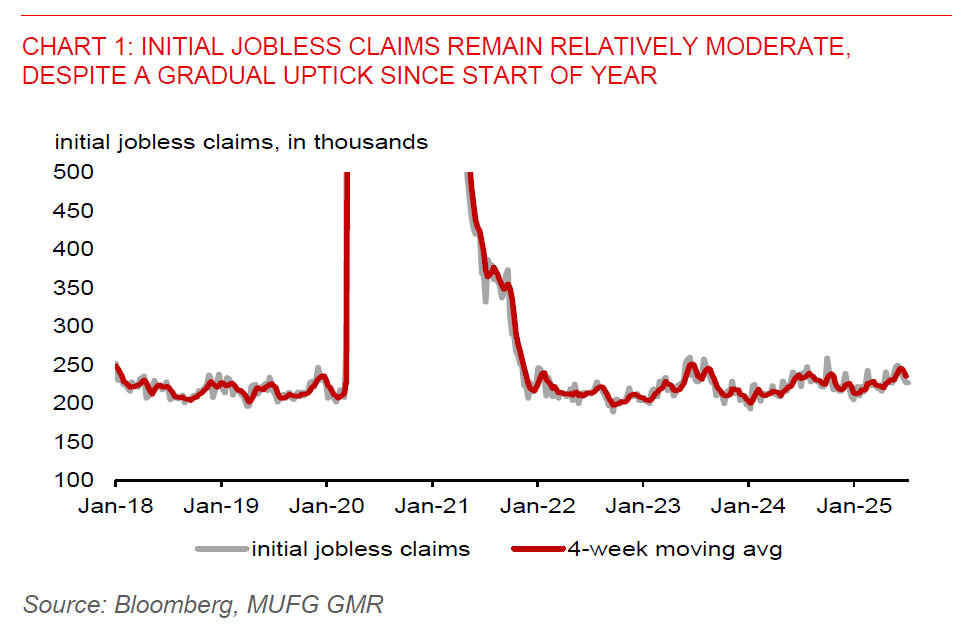 US Treasury yields rose across the curve and the US dollar index (DXY) extended gains by 0.2%. Initial jobless claims fell to 227,000 last week, the lowest level in 2 months, and down from the 232,000 in the prior week. However, continuing claims edged up to 1965k from a downward revised 1955k in the prior week. This may reflect slower hiring or it’s getting harder to find jobs. Still, the moderation in initial jobless claims may keep the Fed in a wait-and-see mode as it observes the potential impact of tariffs on inflation. With Trump imposing 50% tariff on copper, starting 1 August, along with higher reciprocal tariffs on trading partners, the risks to inflation are tilted to the upside. While markets still anticipate a Fed rate cut in September, expectations have moderated somewhat following the stronger than expected June non-farm payrolls report released on 3 July.