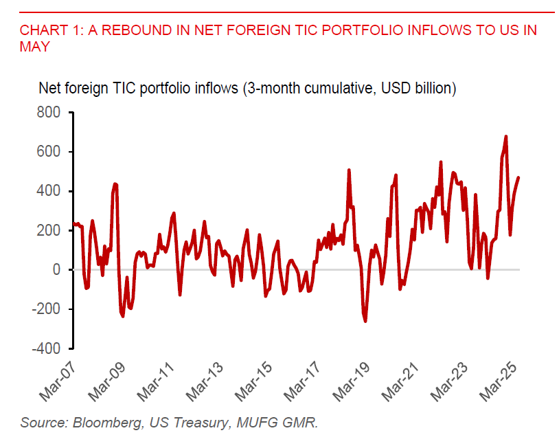 Meanwhile, initial jobless claims fell to 221k for the week ending 12 July, down from 228k the prior week and below market estimates of 233k. Additionally, net foreign TIC portfolio inflows surged to $311.1 billion in May, following $14.2 billion in net outflows in April, when President Trump first announced reciprocal tariff rates on trading partners.