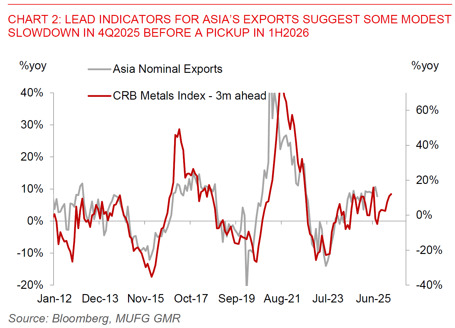 Beyond China’s macro data, the data out of Asia has thus far been quite robust despite tariffs announced by the US. Thailand’s exports rose by 19%yoy for September as an example, while we had South Korea’s 3Q GDP numbers which surprised markets on the upside at 1.2%qoq sa, helped by stronger sequential improvements in private consumption and to a smaller extent government spending. The latter also fits in with the recent Bank of Korea’s less dovish stance in holding rates, in part due to concerns over a overheating housing market and higher FX volatility in the South Korean won. For Asia’s exports more generally, there are some tentative signs that tariffs by the US have slowed activity in the likes of India (which has 50% reciprocal tariffs) and Taiwan, but overall the absolute levels in exports have held up quite well. This could well change moving forward given the payback from front-loading coupled with upcoming sectoral tariffs including on pharma and semiconductors, but for what it’s worth our best lead indicators on Asia’s exports including from metal prices suggest some modest slowdown into year-end before a pickup later in 1H2026.