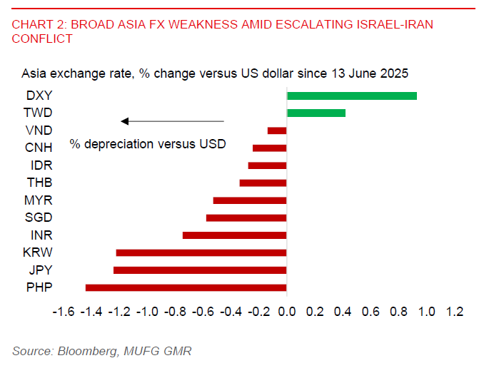 Asian currencies have broadly weakened against the US dollar following the escalation in the Israel-Iran conflict last Friday. KRW (-1.2%), PHP (-1.4%), and INR (-0.7%) have led losses in the region since last Friday, driven by risk aversion and rising oil prices. Oil prices have surged by up to 10%, while a prolonged conflict in the Middle East could further hurt global risk sentiment. Singapore’s weak trade data in May also adds to regional concerns.