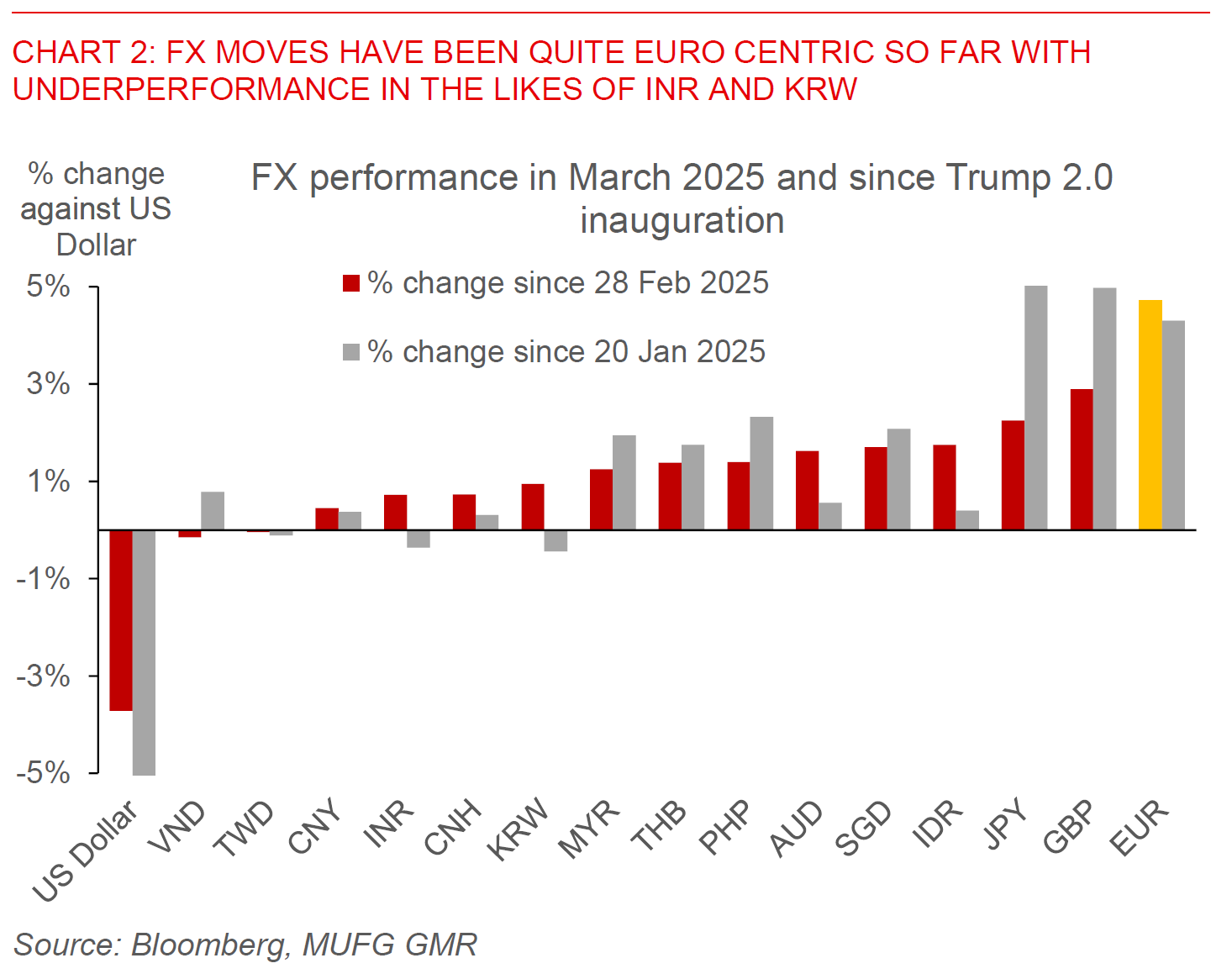 Market moves have been seismic and historic last week, with a big move lower in the US Dollar by close to 4%. The big structural shift for FX markets was certainly the big fiscal announcement by Germany’s Chancellor Elect Federich Merz to exempt defence spending above 1% of GDP from the constitutional debt brake, raise EUR500bn for a special fund for infrastructure (11% of GDP) to be disbursed over 10 years, and allow regional governments to borrow up to 0.35% of GDP. If passed by Germany’s parliament, this likely represents a meaningful demand shock, even if there are existing capacity constraints which likely prevents an immediate ramp up in defence and infrastructure spending. Our European economists see a 0.8% boost to Germany’s GDP in 2026 to around 2% (see Euro – the brakes are off in Germany). From an FX perspective, our G10 team has been highlighting a slowing US economy as well as the possibility of greater fiscal stimulus from Germany as key driving forces for their medium-term call for a weaker Dollar (see G10 FX Weekly). On that note, US non-farm payrolls print out on Friday was decent at 151k, but declines in federal government and retail employment suggest this could soften more moving forward.
