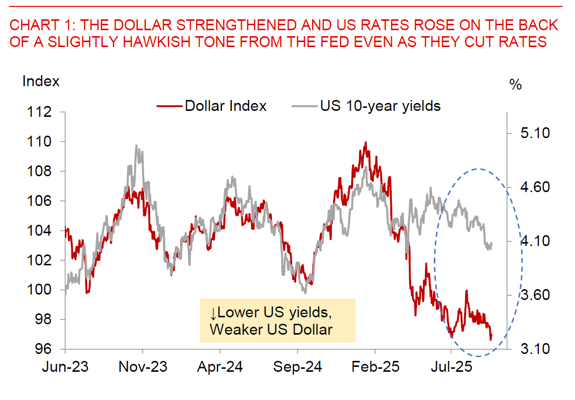 The Federal Reserve cut the Fed funds rate by 25bps as expected bringing the Fed Funds mid-rate to 4.125% from 4.375% previously. The key takeaway from the meeting including from the press conference by Chair Powell was that this was a slightly hawkish leaning policy decision, in the broader context of a rates market which have already priced quite a lot of rate cuts for 2026. This is notwithstanding a dissent for a 50bps cut by new Fed Governor Stephen Miran and him also likely pencilling 150bps cuts for 2025 in the dot plot. The hawkish takeaway was for a couple of reasons. First, Chair Powell viewed the weaker job numbers as also reflecting lower labour supply from immigration, and as such not primarily about demand in his view. Second, Chair Powell also viewed the rate cut as a risk management move and as such not necessarily reflecting a clear start of a series of rate cuts. Third, the dot plots from the FOMC meeting added just one additional 25bps rate cut for both 2025 and 2026 which likely disappointed markets to some extent.
