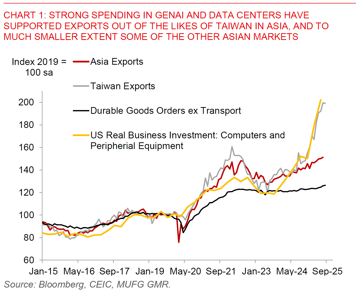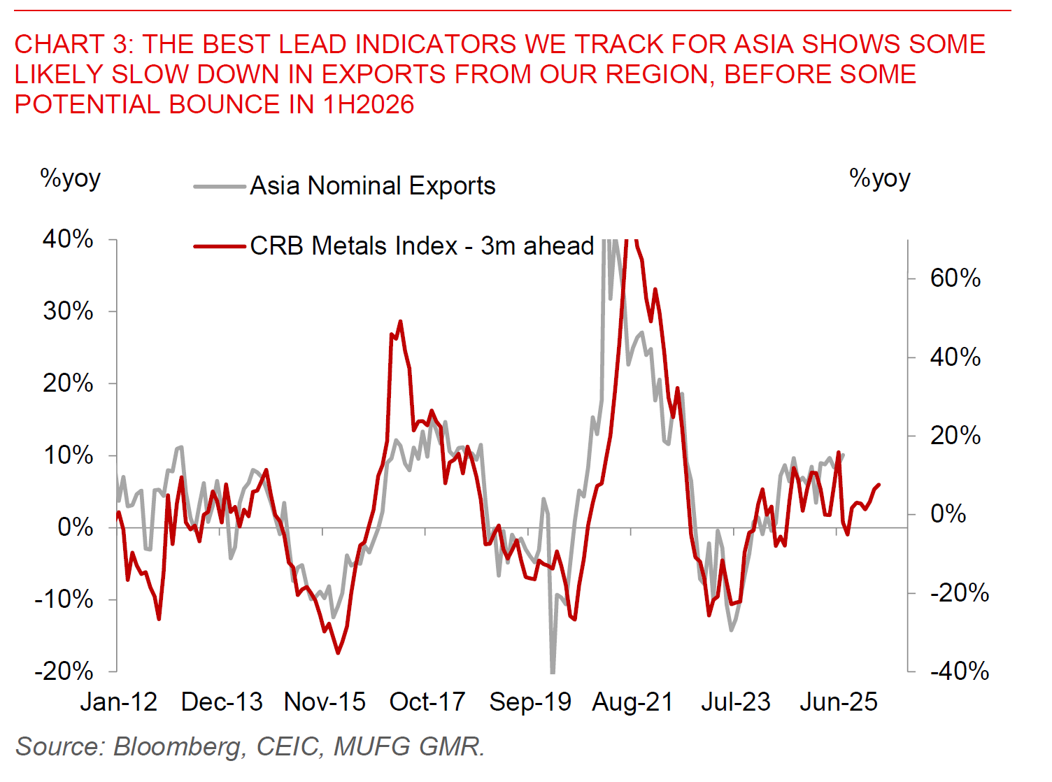 First, better than expected US macro data. 2nd quarter GDP in the US was revised up to 3.8% annualized, from 3.3% in the initial estimate, with personal consumption in particular estimated to rise 2.5% (from 1.6% in the preliminary estimate). Business investment rose by 7.3%, driven by higher spending on data centers, computer related equipment such as GPUs, coupled with stronger software spending. Of course, these numbers are backward-looking and also distorted by front-loading to some extent ahead of tariffs. The more timely indicators for August provide for a more mixed picture, with US durable goods orders ex transportation rising a stronger than expected 0.4%, while US goods imports fell 7% driven by softer consumer goods and also likely gold-related imports. Net-net, for Asia, the best lead indicators we track for Asia exports shows that exports are likely to slowdown modestly in the coming months, but interestingly are tentatively pointing towards a potential pickup in activity as we head into 2026.