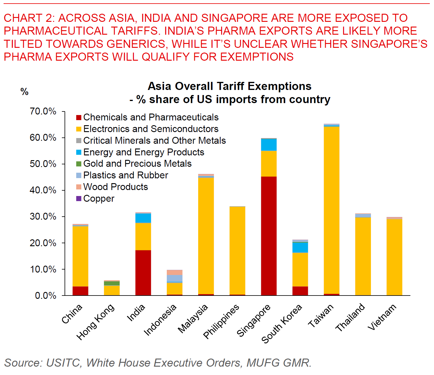 Looking at Asia specifically, it is still unclear how branded or patented pharmaceutical products will be defined, but our working assumption is that this will not incorporate generic drugs and pharmaceutical shipped by the likes of India to the US. As such, India could be spared from these announcements – perhaps for now. Across Asia, Singapore stands out as being far more exposed with 40% of its exports to the US currently enjoyed exemptions in the pharmaceutical sector, and with its products likely skewing more towards the higher end. A quick search of some of the more significant FDI into Singapore by pharma companies shows that many of the big names with investments in Singapore including Pfizer, GSK, MSD, Roche and Sanofi seem to have plans for investment in the United States. While that could be a saving grace, the implementation and impact for the likes of Singapore and India are still highly unclear at this moment on the pharma sector.