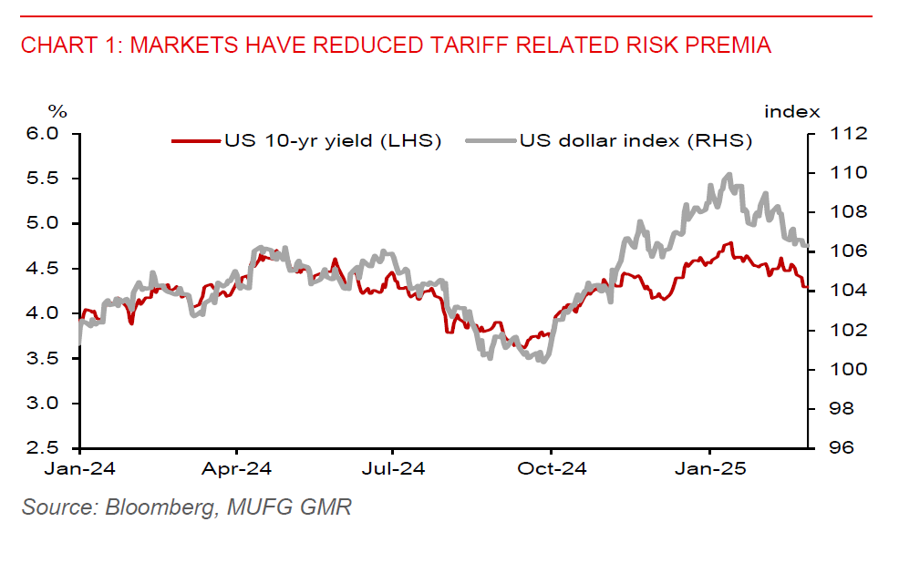 Markets have reduced some tariff related risk premia for now, with the US 10-year yield falling back to nearly the pre-US election level at 4.27%, from a mid-January peak of 4.80%. The broad US dollar index (DXY) has also fallen to the 106.30-level after peaking at 110.00. But the latest news is that Trump will not be stopping tariffs. He has said that “tariffs will go on, not all but a lot of them”. He has also announced that the 25% delayed tariffs on Canada and Mexico will come into effect on 2 April, while he plans to impose tariffs on EU, with 25% on autos, among other things.