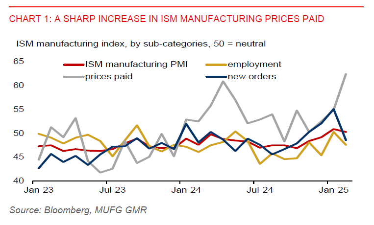 What’s also concerning is the jump in US ISM manufacturing prices paid, with the index rising to 62.4 from 54.9, beating Bloomberg consensus of 56.0 and reaching the highest level since June 2022. Prices paid have increased for four straight months, suggesting inflationary pressures are starting to build at the producer level. However, it’s unclear how much of the higher costs that producers will be able to pass through to consumers, at a time when new orders have contracted.