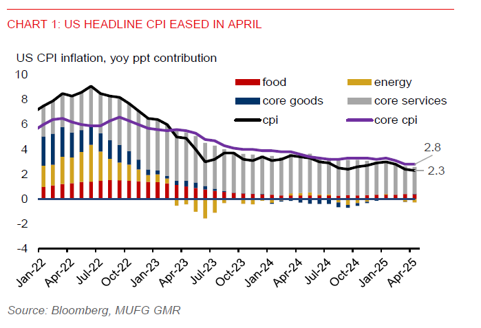 President Trump’s import tariffs are widely expected to push up inflation in the US. But the impact on US inflation from tariffs has largely not shown up in the April CPI report. Companies may still be working through the large inventories that were stocked up ahead of tariffs, allowing them to not raise prices yet. And with the US temporarily lowering tariffs on most goods from China to 30% for the next 90 days, from 145% previously, it likely suggests a milder pickup in US inflation in the coming months.