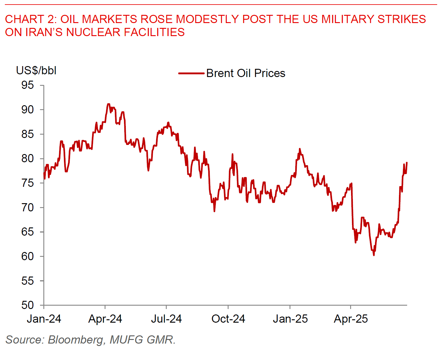 The market response for what it’s worth as Asia opened was reasonably modest, with Brent oil prices rising above US$79/bbl on Monday morning from US$77/bbl last Friday. Meanwhile, the US dollar was stronger by 0.35%, with Asian currencies generally weaker. The South Korean won and Thai Baht underperformed, weakening by 0.6%, while the Indian Rupee 1 month NDF softened by 0.3%. Meanwhile, the likes of CNH and to some extent SGD were more resilient. While we do not know how exactly the Israel-Iran conflict will play out from here, we just published a report providing a sensitivity analysis to help provide a gauge on potential winners and losers across our region if oil prices were to rise further (see Asia: The impact of oil price shock on Asia FX – a scenario analysis). Our analysis shows that PHP, KRW and THB are more vulnerable in Asia from an FX perspective to further sharp spikes in oil prices. INR is also relatively more vulnerable with a current account deficit closer to 2% of GDP together with relatively higher economic linkages to the Middle East. Meanwhile, the likes of MYR, IDR and TWD should be more resilient. We think the impact on CNY is likely to be minimal. While we will likely adjust our FX forecasts for the likes of INR and PHP weaker given this external shock, given how FX levels in both currencies have already moved weaker, the risks for both currencies could be more two-sided now even as we continue to acknowledge the significant uncertainty in the next steps of the Israel-Iran war.